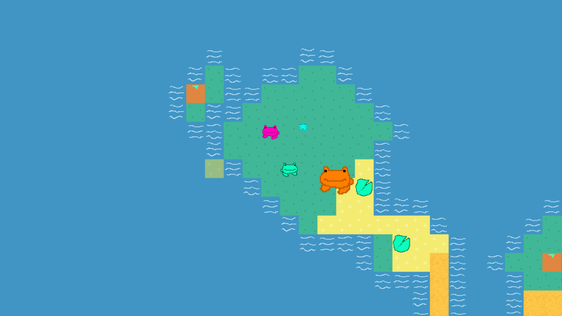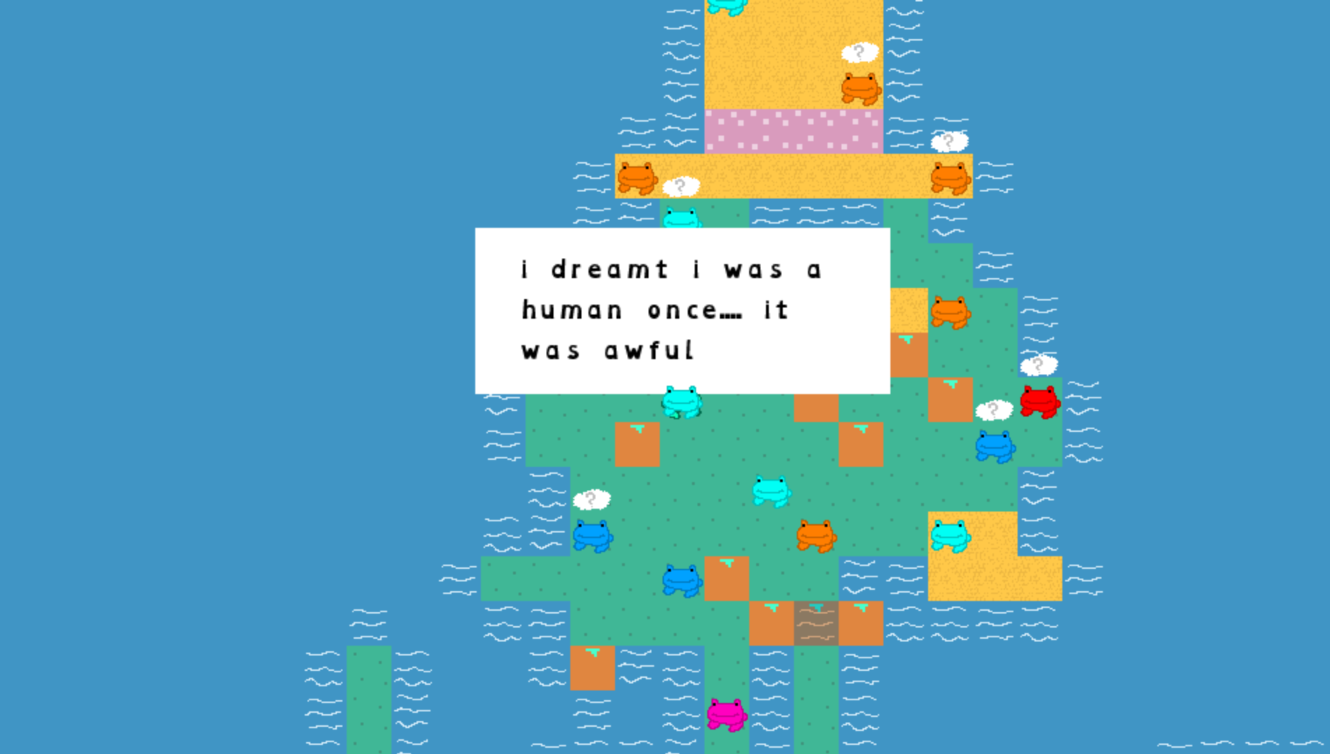 As players take turns talking to the frogs or drawing blocks in the world, the game slowly becomes a reflection of the thoughts and values of the space around it.